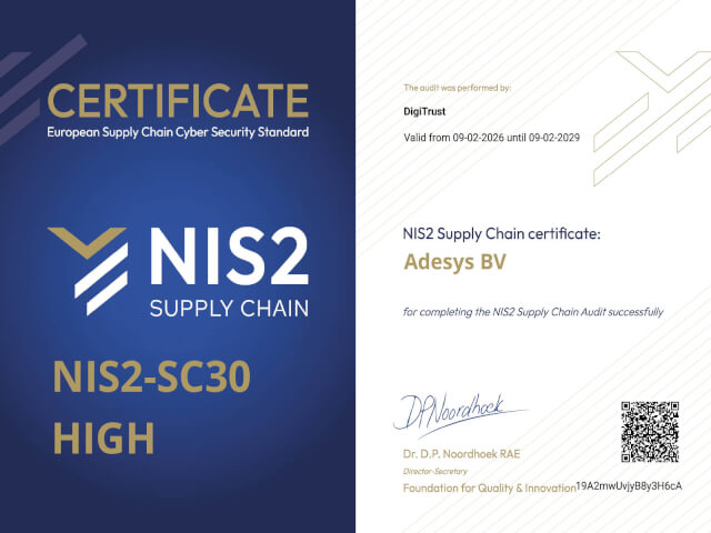 Wir sind stolz darauf, bekannt geben zu können, dass Adésys die NIS2-SC-Zertifizierung auf dem Niveau SC-30 High erhalten hat. Mit dieser Zertifizierung zeigen wir, dass unsere Informationssicherheit und Cyber-Resilienz nachweislich auf einem hohen Niveau eingerichtet und gesichert sind. NIS2-SC ist eine wertvolle Ergänzung zu unseren früheren ISO 9001- und ISO 27001-Zertifizierungen, die wir im Oktober 2025 erhalten haben.