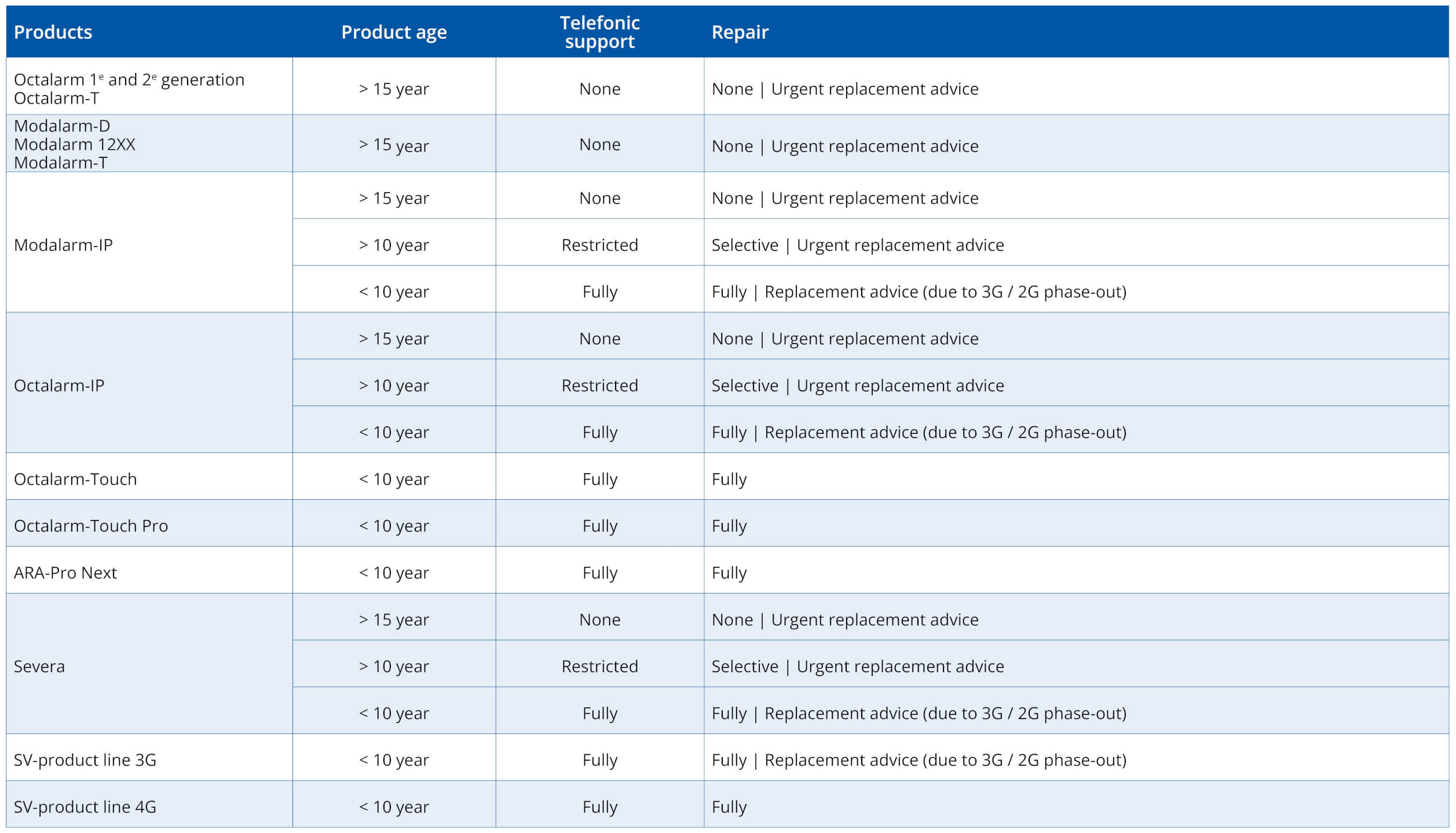 As a guideline, the reliability of alarm devices older than 10 years may decline noticeably faster. Depending on the conditions of use, this may also be the case sooner. The overview below provides clear information about the support that applies to our products. If, after investigation, the repair costs exceed €129.00 and the alarm is 10 years old or older, we will contact you by telephone.