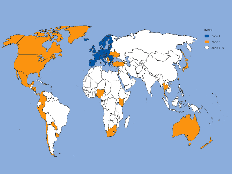 Octalarm Connect tiene cobertura en Europa (zona 1; área azul) y en Australia, Nueva Zelanda, Japón y algunos países de Sudamérica y África (zona 2; área naranja). Descargue el resumen Ir al resumen 'Dónde Octalarm Connect tiene cobertura' (en inglés)