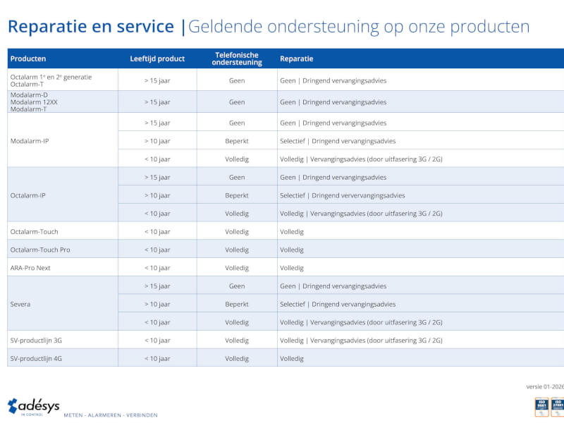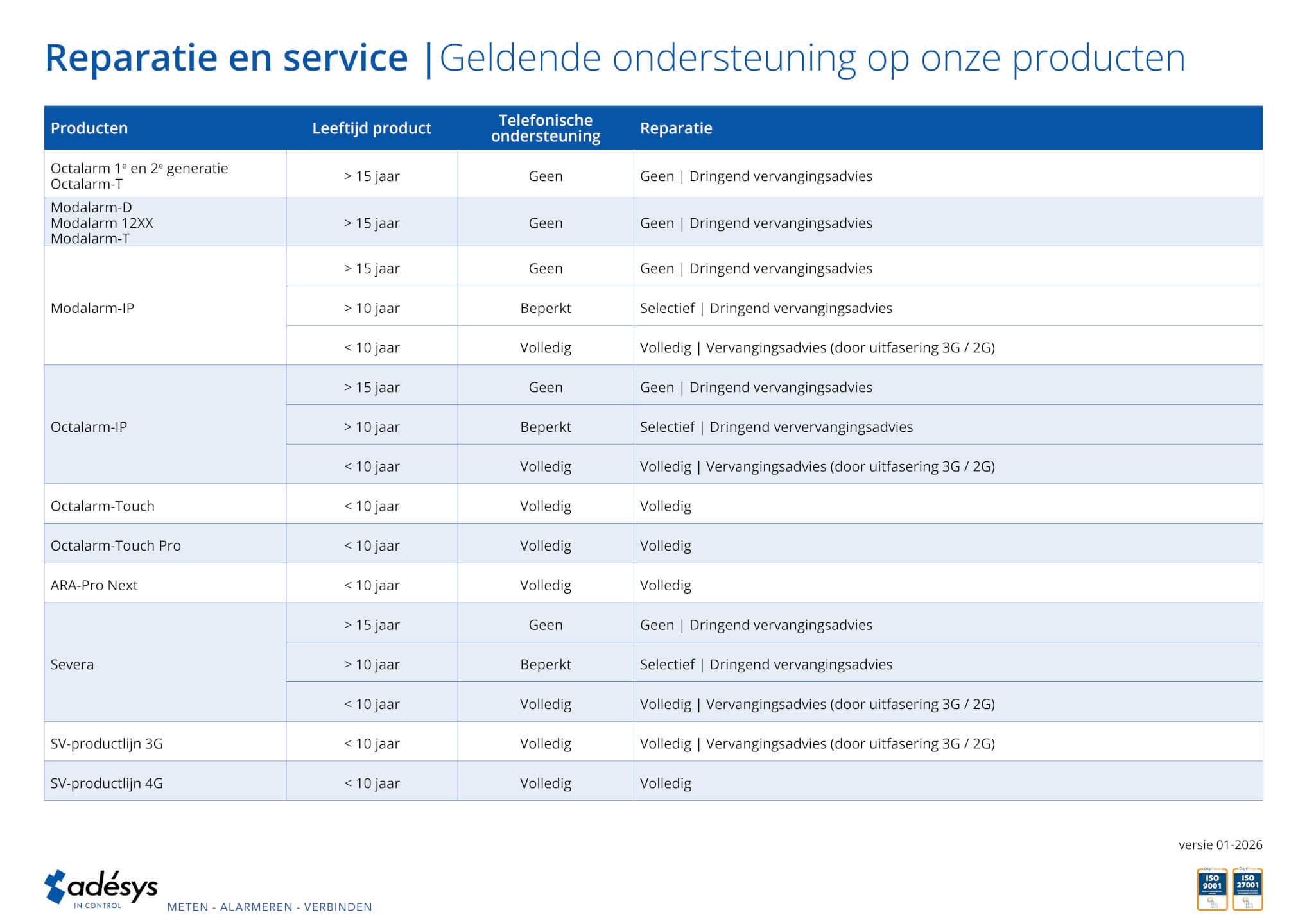 Als richtlijn kunt u aanhouden dat de betrouwbaarheid versneld zal afnemen bij alarmmelders ouder dan 10 jaar. Afhankelijk van de gebruikscondities kan dit zelfs eerder zijn. Onderstaand overzicht geeft daarom duidelijke informatie over de geldende ondersteuning op onze producten.
