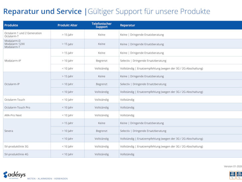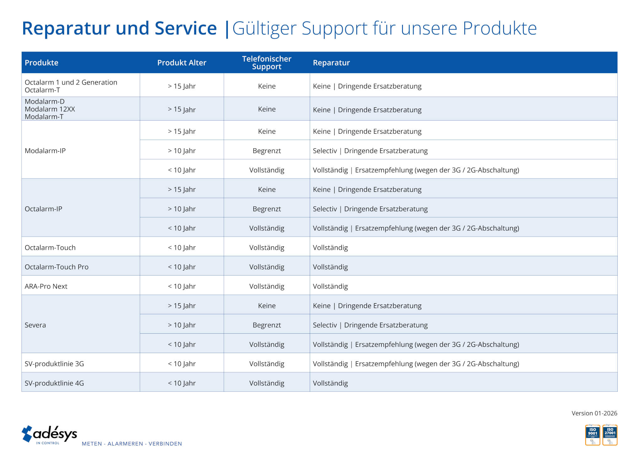 Als Faustregel gilt, dass bei Alarmmeldern ab einem Alter von zehn Jahren mit einer beschleunigten Abnahme der Zuverlässigkeit zu rechnen ist. Je nach Nutzungsbedingungen kann dieser Rückgang auch schon früher eintreten. In der nachstehenden Übersicht finden Sie deutliche Informationen über die Unterstützung, die wir für unsere Produkte bieten.