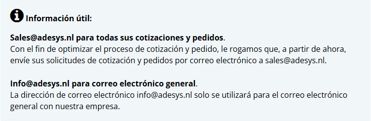 Solicitud de presupuesto y realización de pedidos: sales@adesys.nl